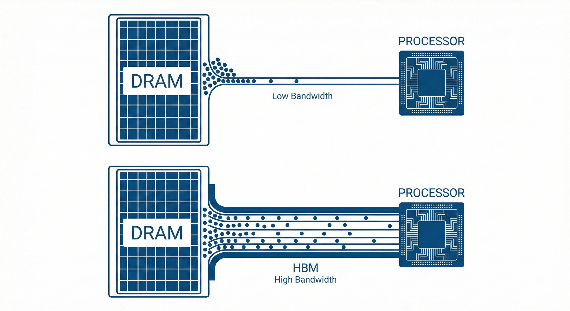 Because GPUs must handle various unknown tasks, they frequently read from and write to external memory. To alleviate this bottleneck, NVIDIA adopted HBM (High Bandwidth Memory).