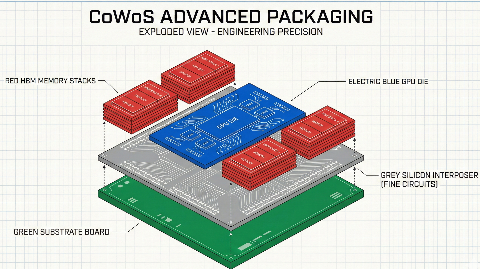 - Extremely high bandwidth: Thousands of wires are embedded in the foundation, allowing GPUs and memory to exchange data at incredible rates.