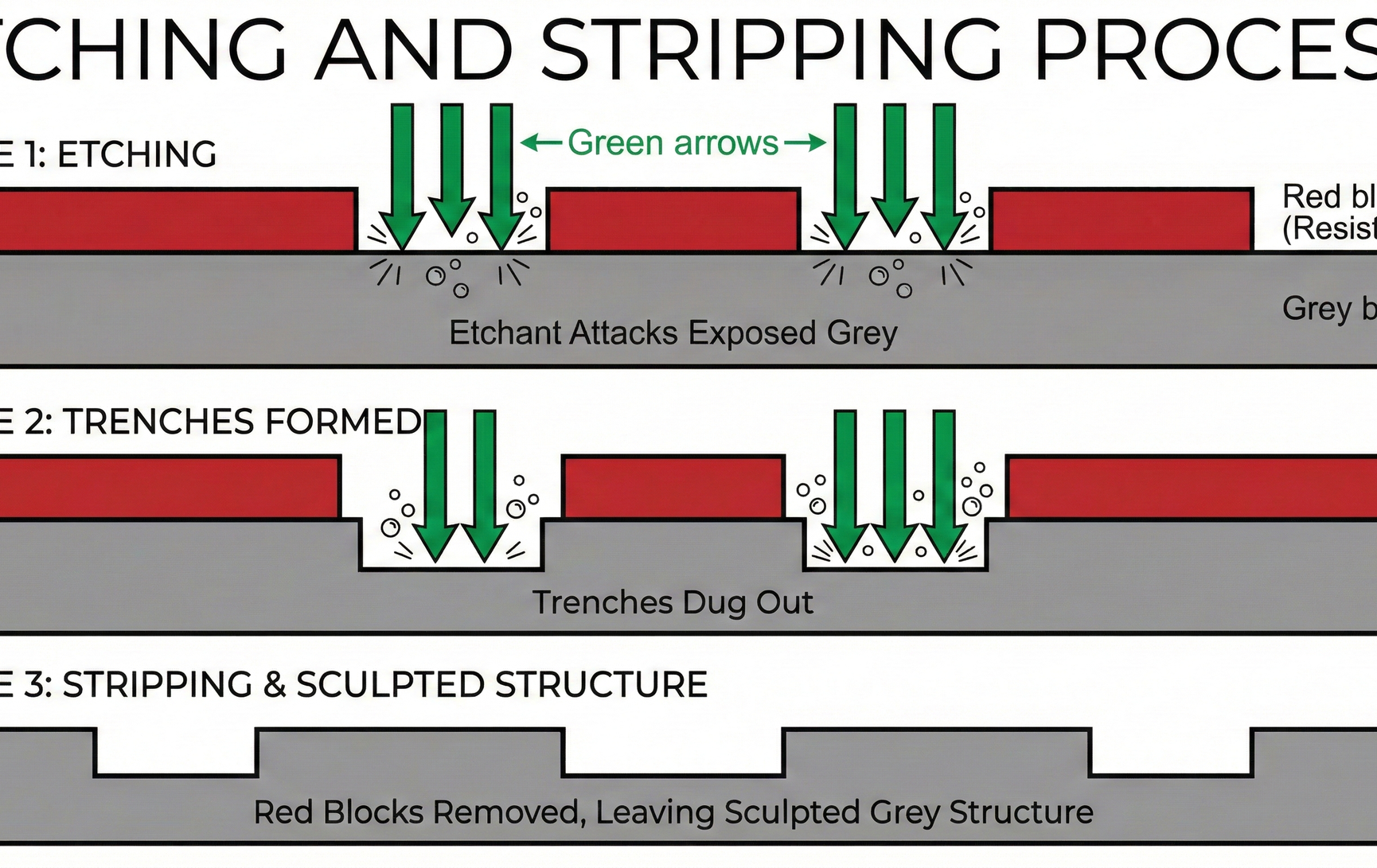 - Action: Chemical agents selectively dissolve the "softened" parts.