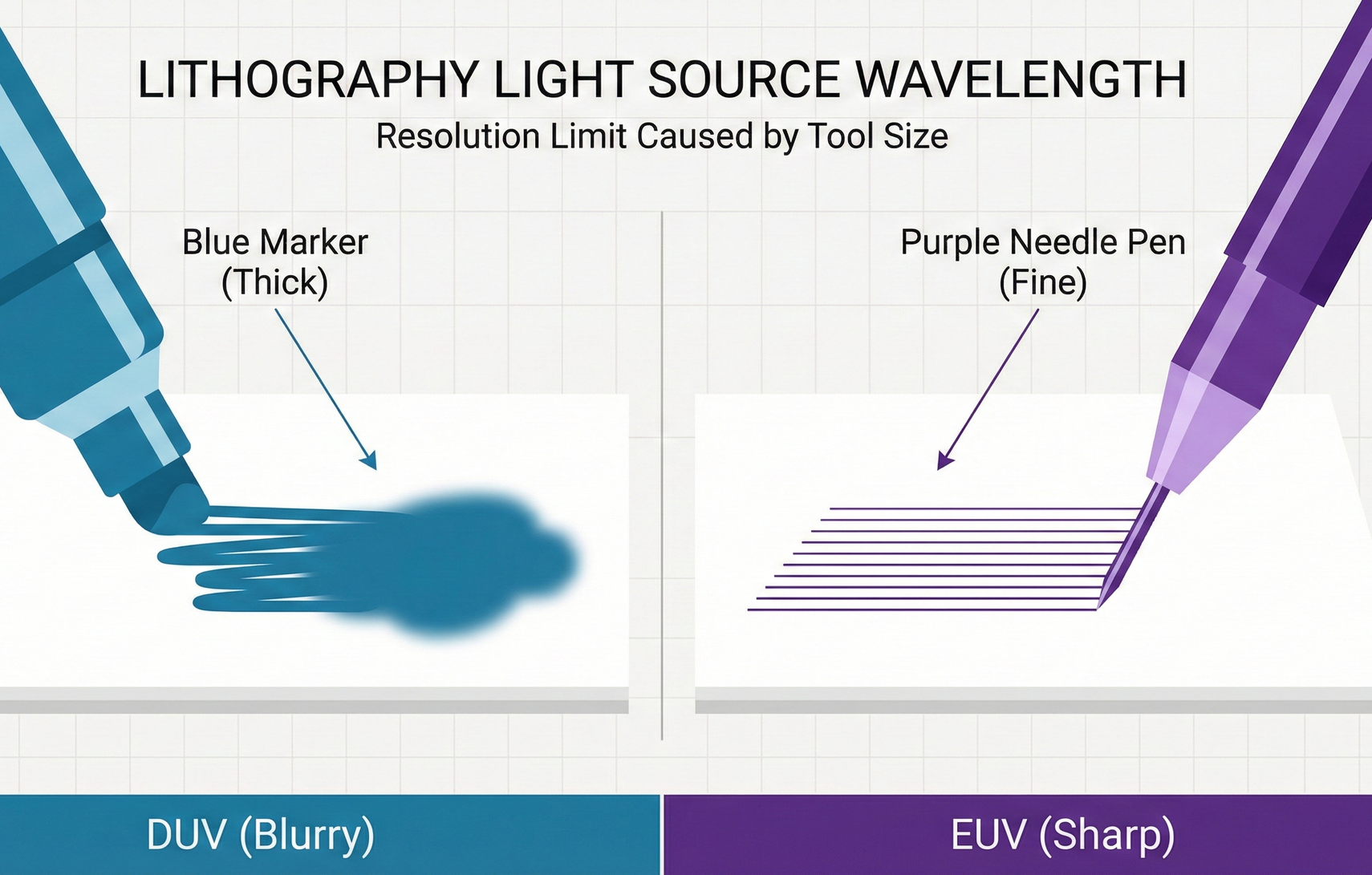 - EUV (Extreme Ultraviolet): Like the finest needle-tip pen. Its wavelength is only one-tenth that of DUV, allowing us to draw clear lines in much smaller spaces.