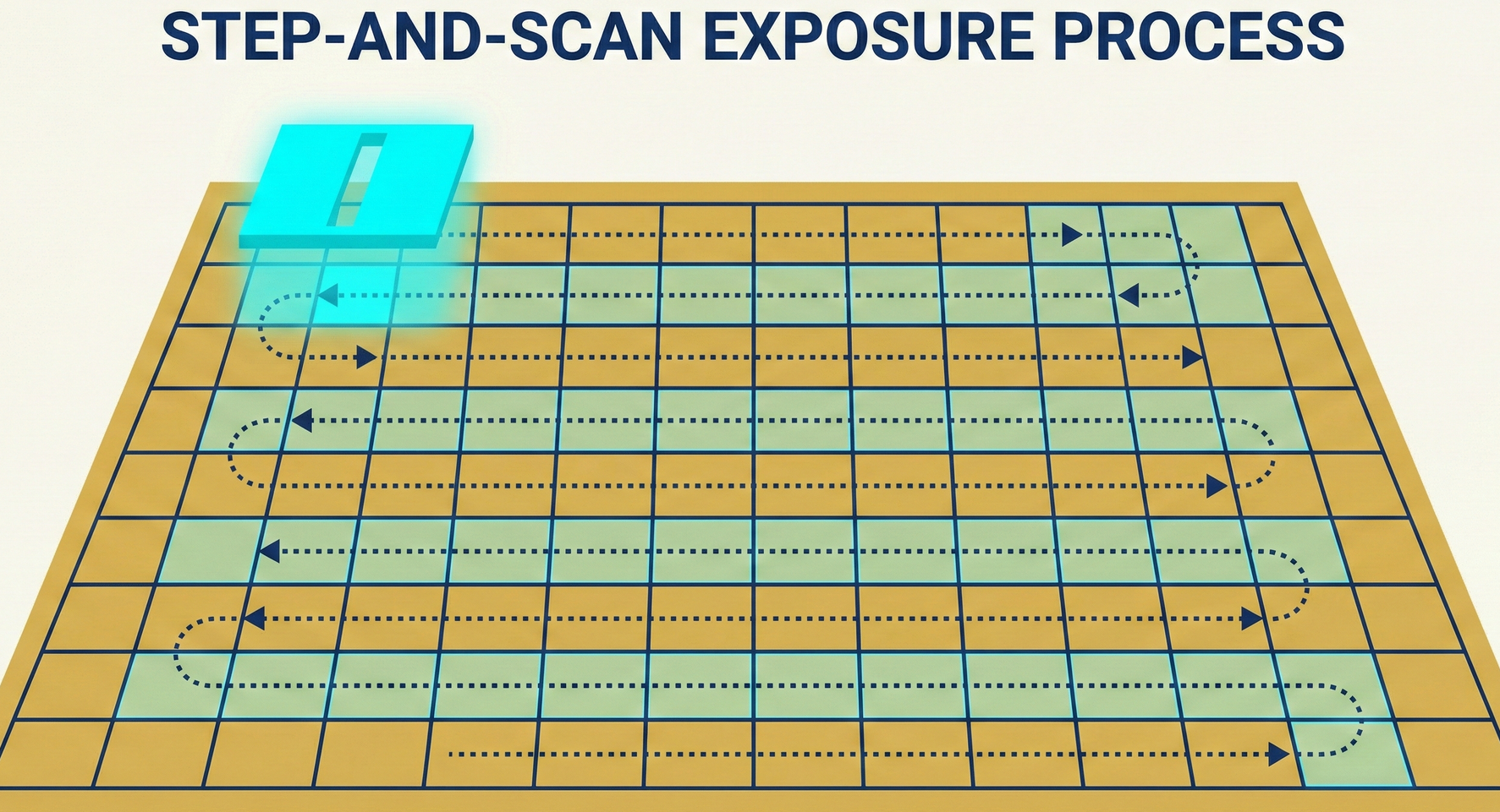 - Step: After scanning one area, the wafer stage quickly moves (Steps) to the next area, where scanning is performed again.