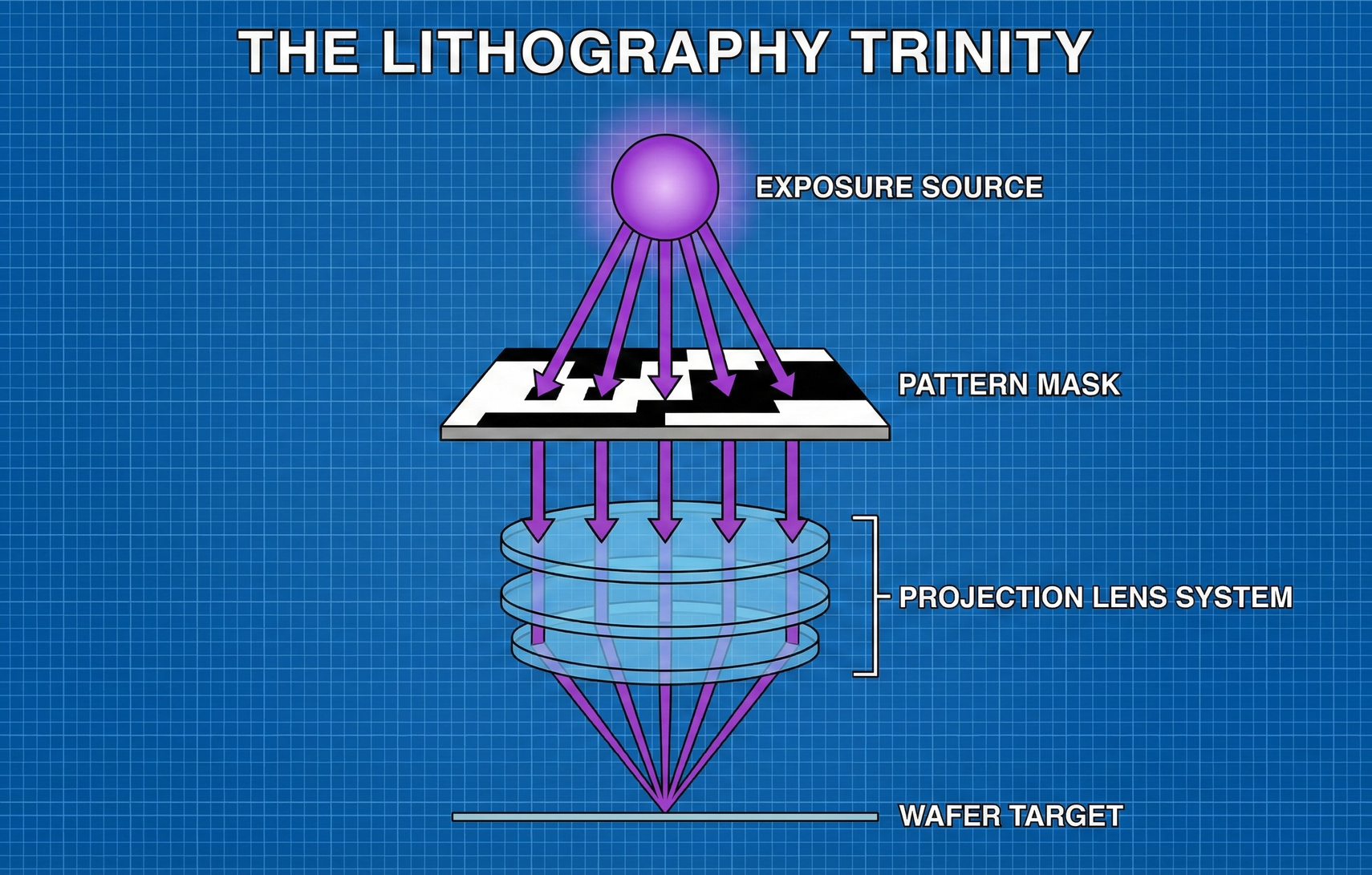 - Reticle (Physical Mask): The data is transformed into chromium metal patterns on glass (a physical stencil).