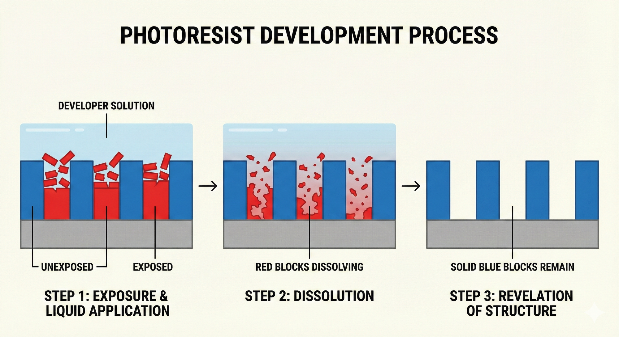 This is the most critical chemical moment. The wafer is once again transferred to a hot plate (approximately 110-120°C).