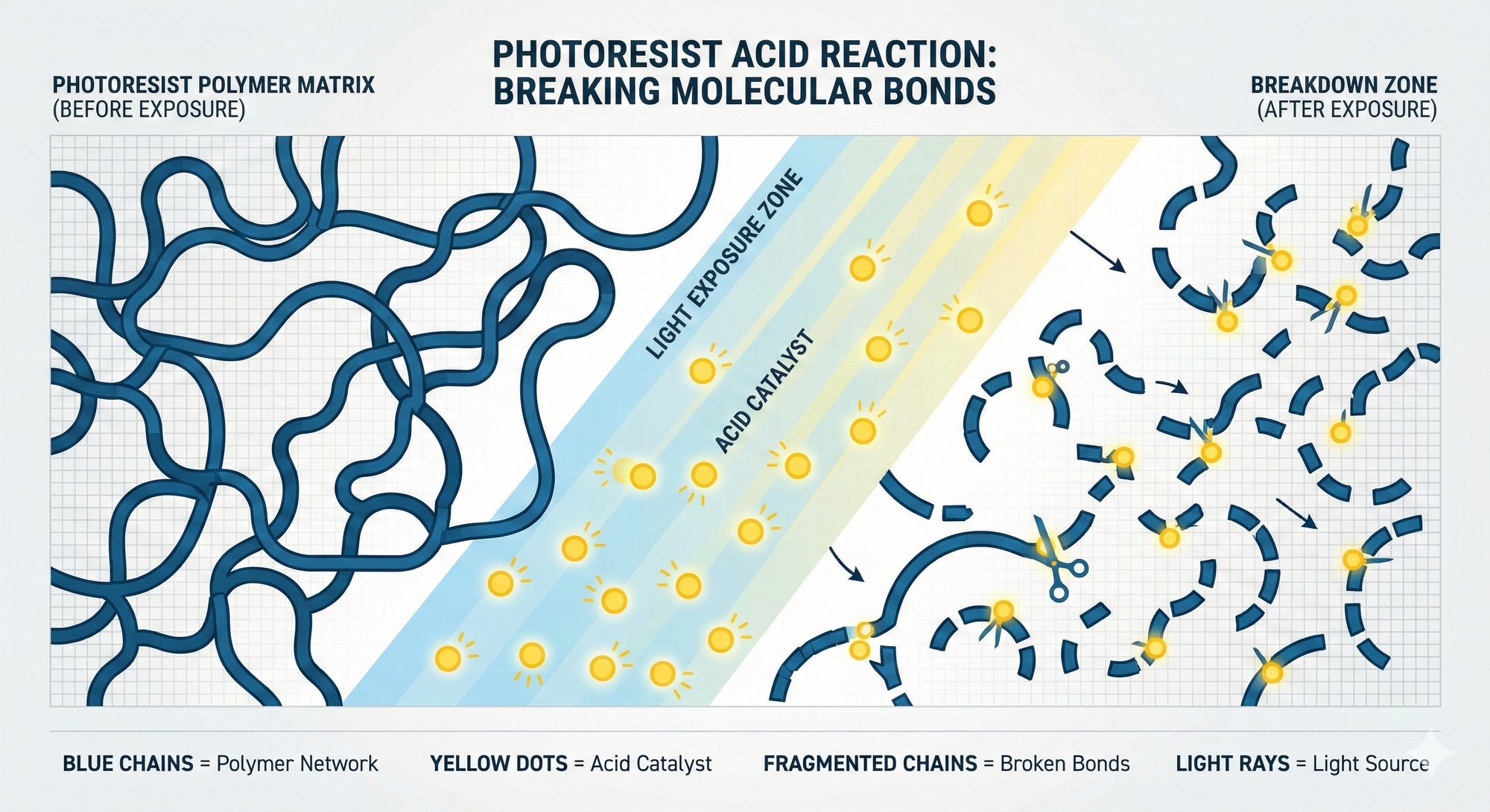 - Scissors: These acids cleave the polymer chains of the photoresist, transforming originally long, water-insoluble molecules into short, water-soluble ones.