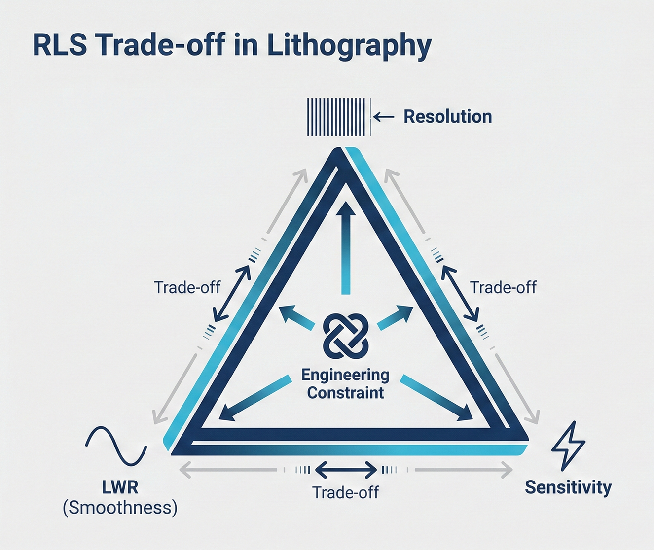 - High Resolution (R): Photoresist molecules must be very small, and acid diffusion distance must be very short (cannot spread too far and blur).