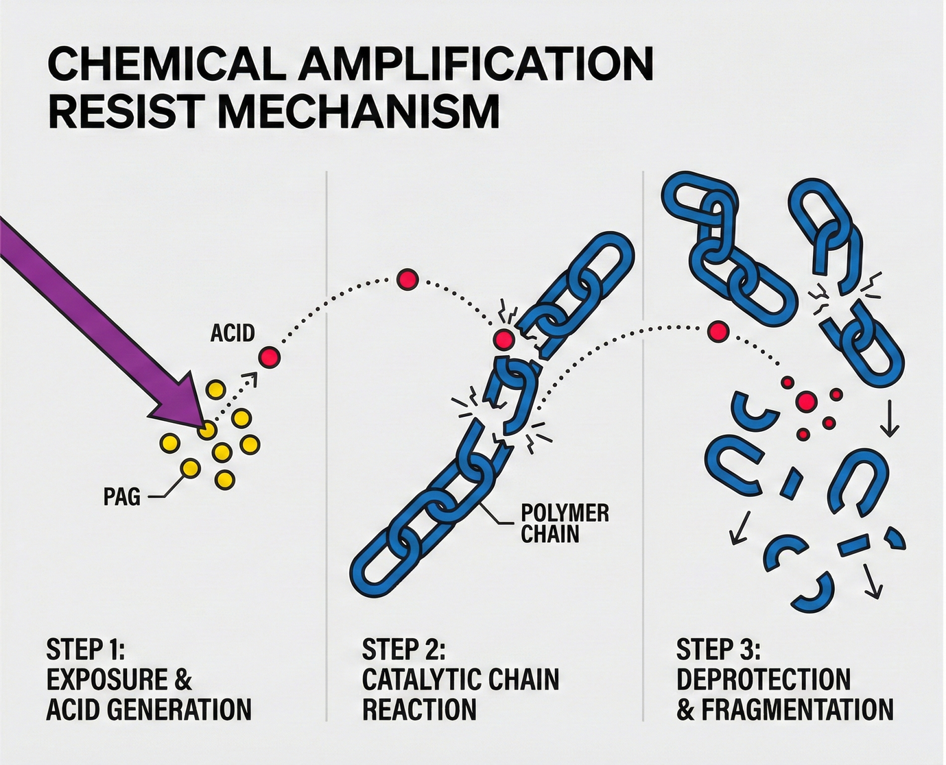 - Catalyst effect: This acid acts like "Pac-man" in a video game. It attacks the protection groups on the polymer side chains, initiating a "de-protection reaction."