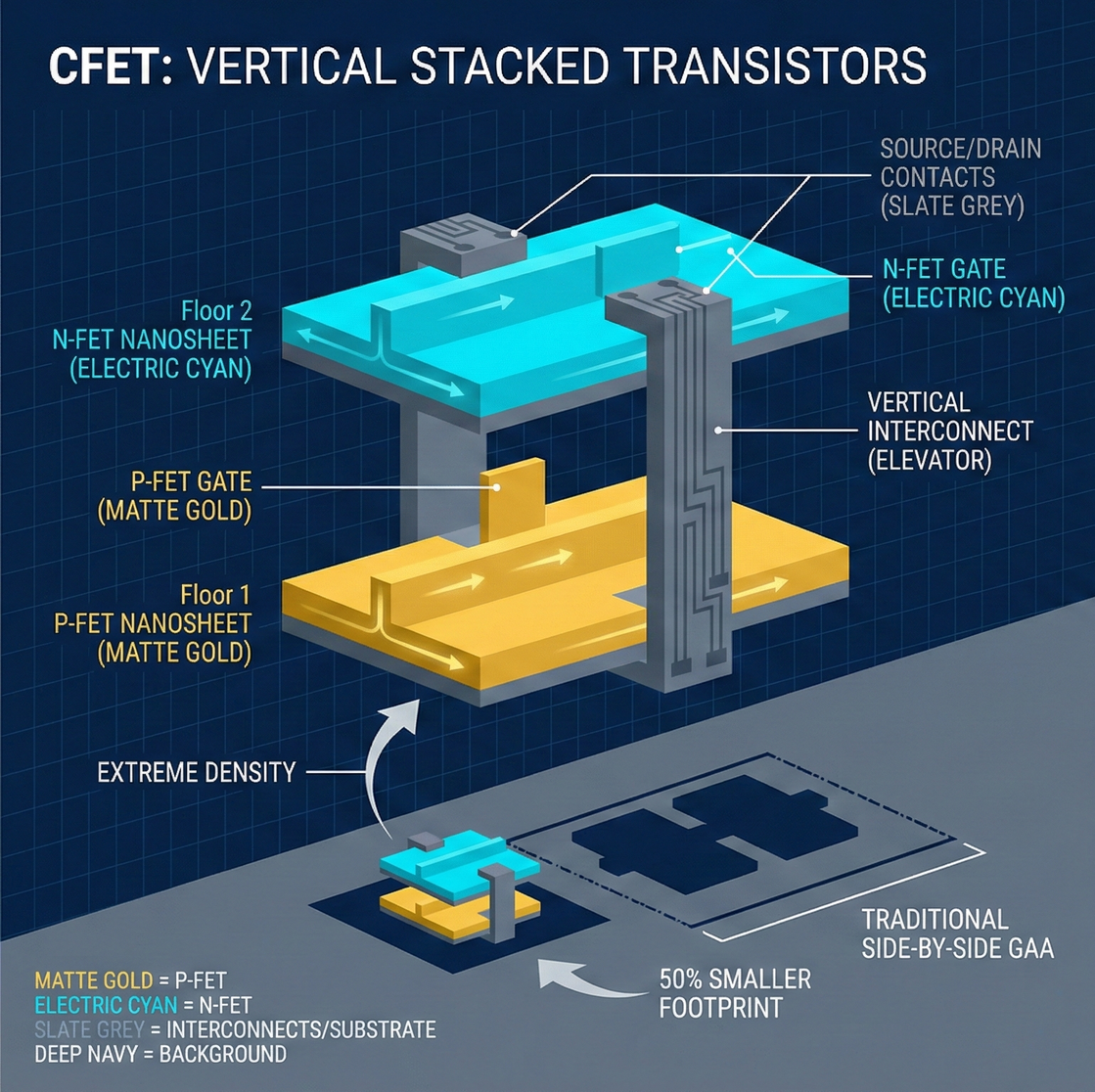 - CFET (Complementary FET): vertically stacks N-type and P-type transistors.