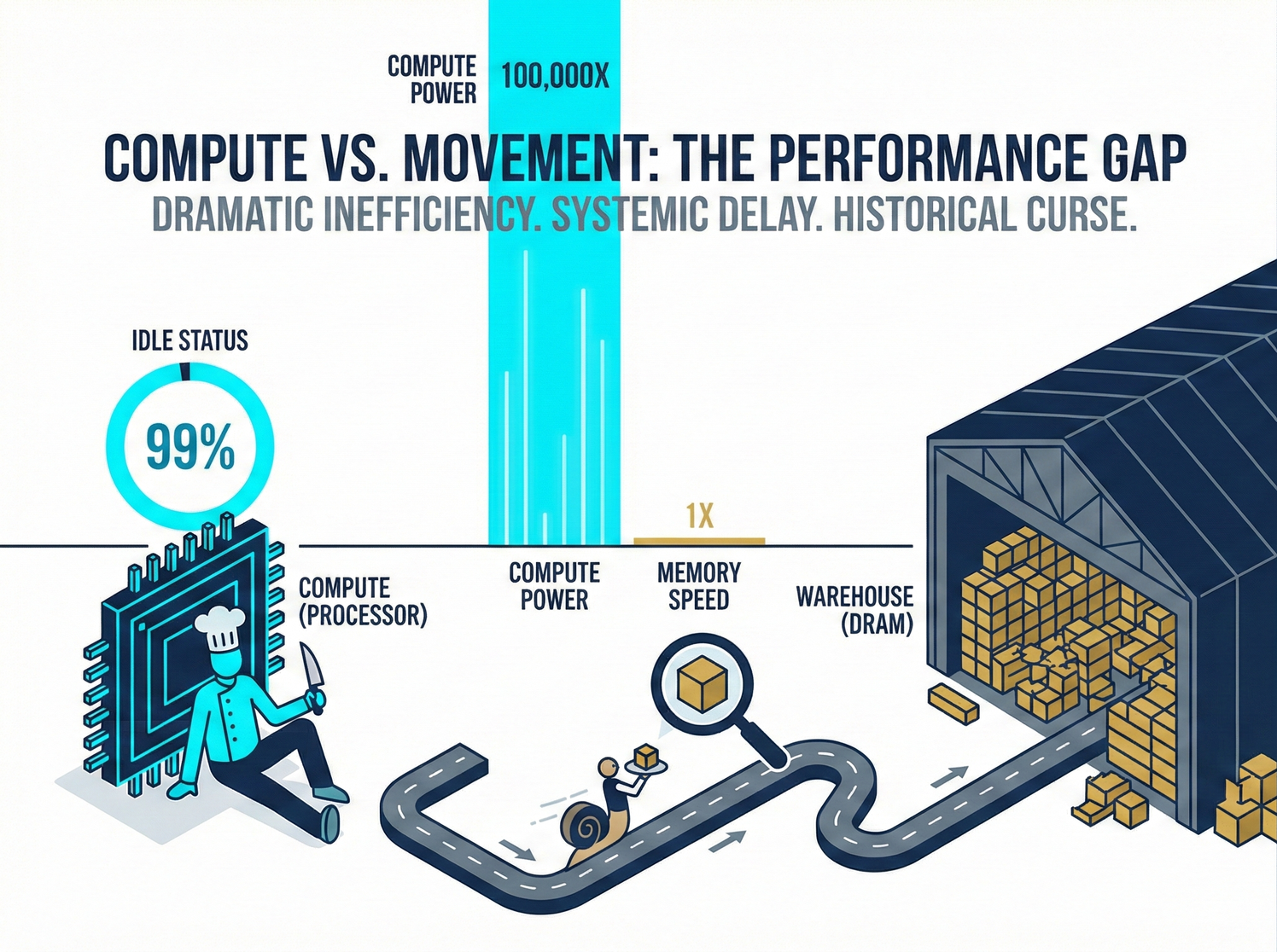 The tragedy unfolds: The chef's onion-chopping speed doubles every two years (Moore's Law); however, the waiter's walking speed has barely improved over the past decade. The result is: the chef spends 99% of his time idly tapping pots and staring blankly in the kitchen, waiting for the waiter to bring the next onion.