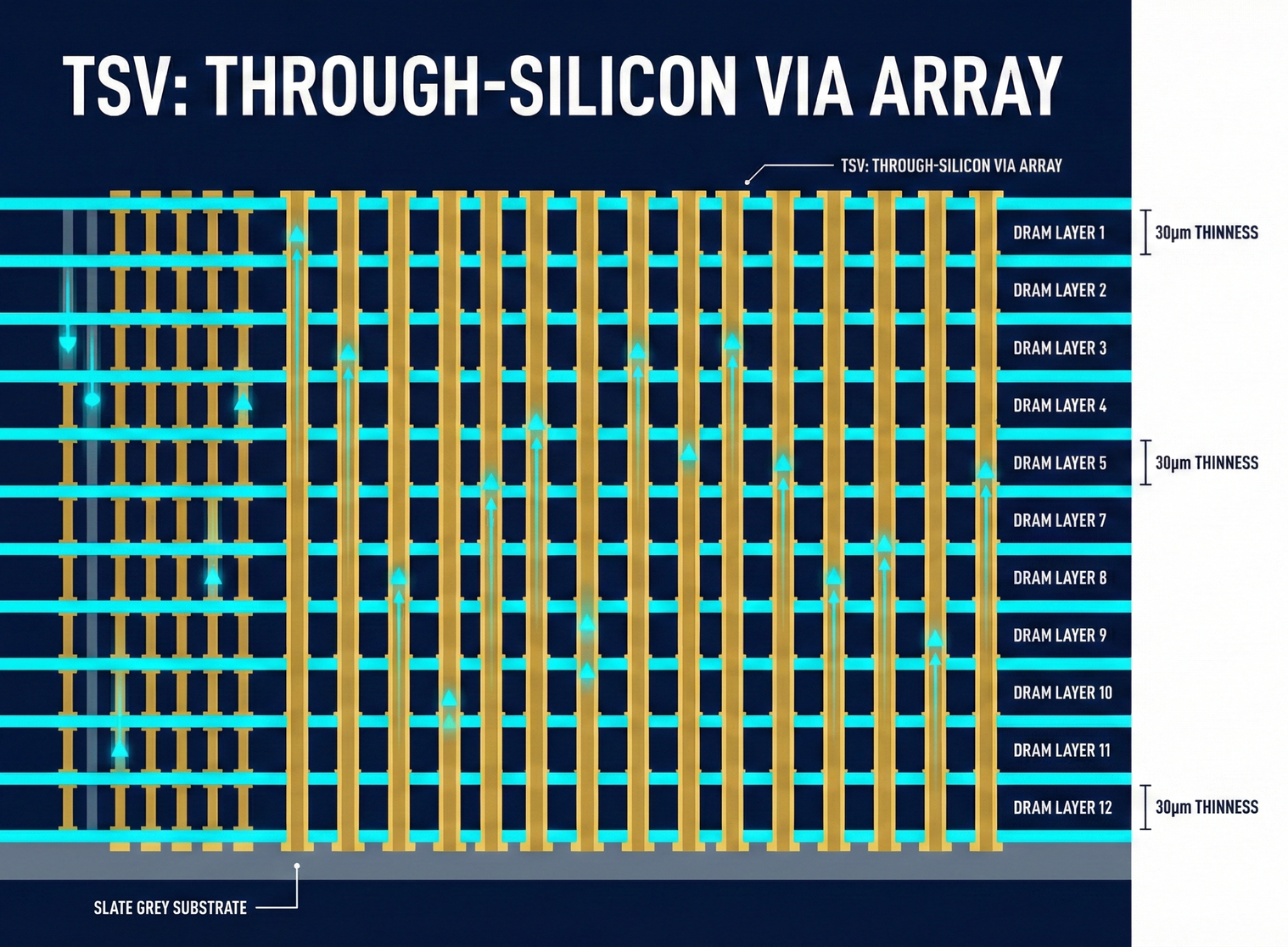 Now that we've stacked 12 DRAM chips into a skyscraper, a fatal physical problem arises: "How does data on the 12th floor get to the 1st floor?" You can't run external wires (because there's no space on the chip's edge). Your only option is to "drill wells" inside the building, creating nano-elevators that go straight to the basement.
