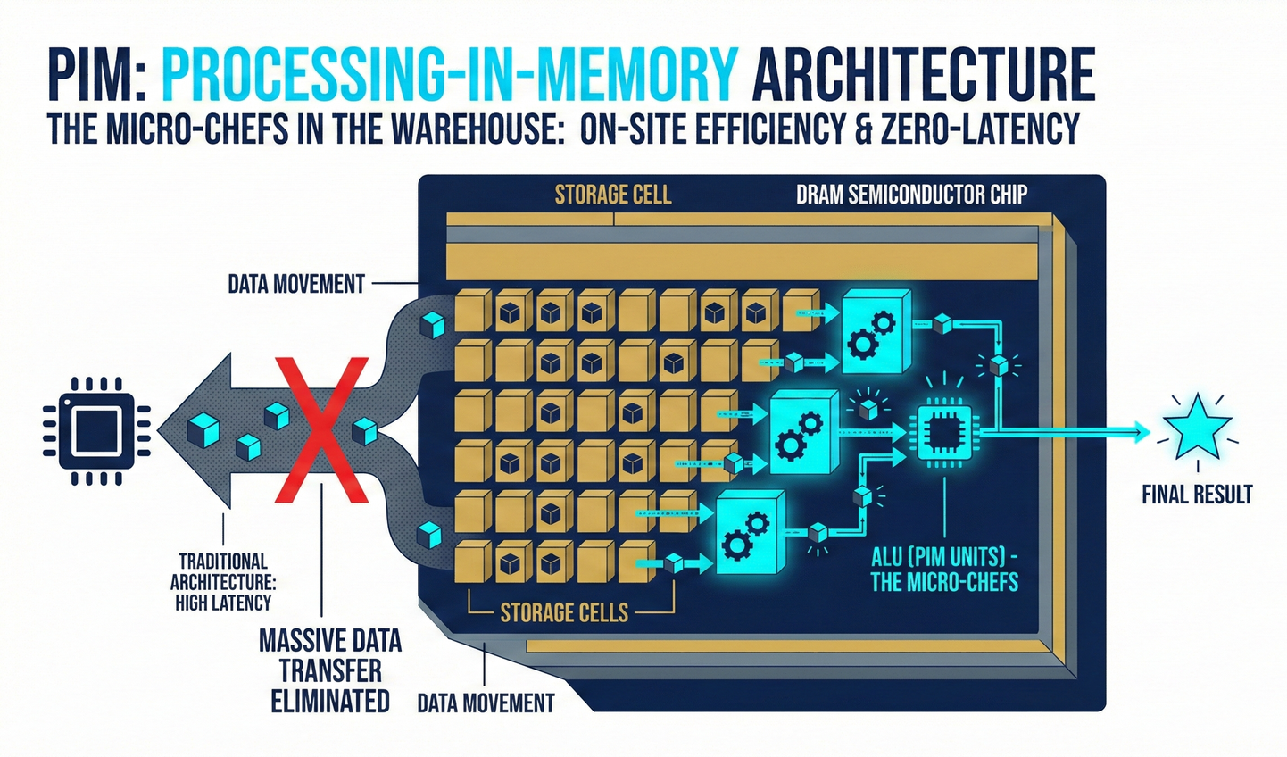 Absolute Advantages: Extreme Power Saving and Zero Latency. Data doesn't even need to leave the memory! When computation is required, the adjacent tiny 'chefs' process it on the spot, sending only the 'final result' back to the CPU. This completely eliminates the immense power consumption and time delays associated with data movement.