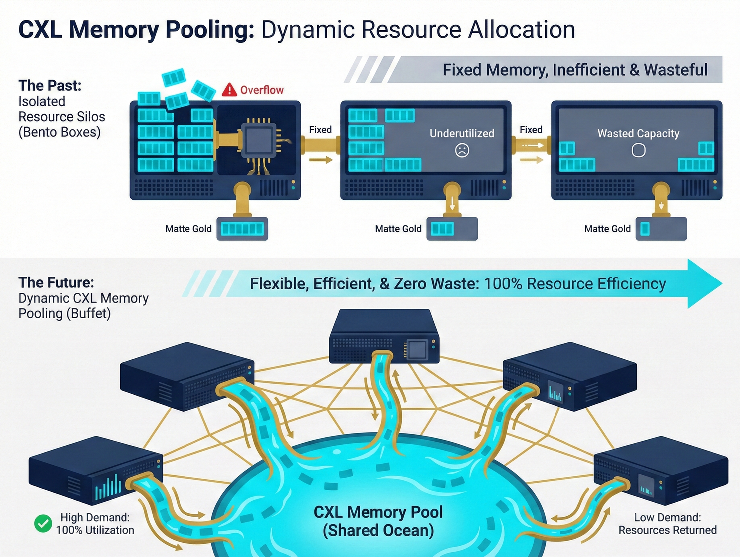 The Current Revolution: Buffet Model 🍽️ CXL completely demolishes the walls between servers. Engineers can plug dozens, even hundreds, of CXL memory cards into an independent CXL Switch, forming an immense 'Memory Pool.' Operational Logic: Does Server A need 100GB? The system dynamically allocates 100GB to it instantly via CXL. Has Server A finished running its AI model? The system immediately reclaims that 100GB and reallocates it to Server C, which suddenly requires high capacity. Strategic Result: Hardware utilization instantly soars from a previous 40% to over 80%. CSPs (Cloud Service Providers) no longer need to blindly purchase expensive memory for every server, leading to a dramatic, cliff-like reduction in procurement costs.