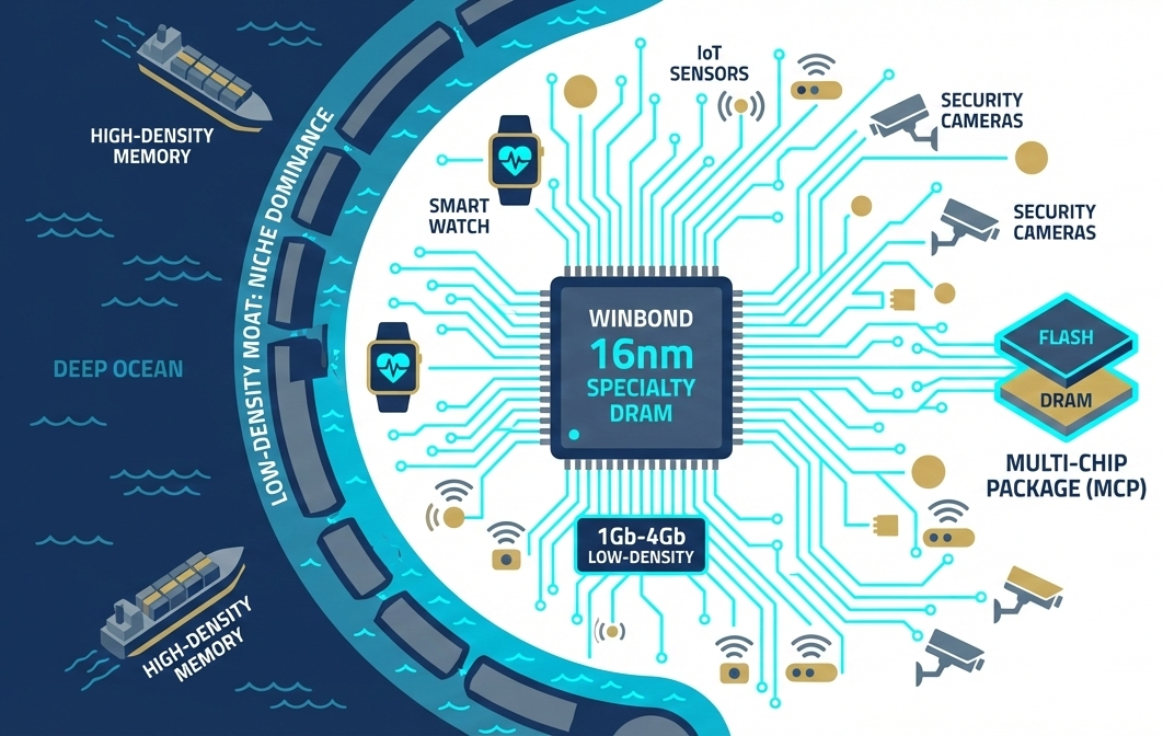 - Edge Advantage: Sidestepping 'Brute-Force Computing': Winbond's core competitiveness lies in low-capacity ($1\text{Gb} \sim 4\text{Gb}$) specialized DRAM. In the AI era, these products will not be found alongside NVIDIA's GPUs, but rather in hundreds of millions of IoT sensors, wearables, and smart access control systems. This 'small density' strategy effectively circumvents direct competition with Samsung and Micron, as for the giants, the return on investment (ROI) for developing such fragmented specifications is extremely low.
