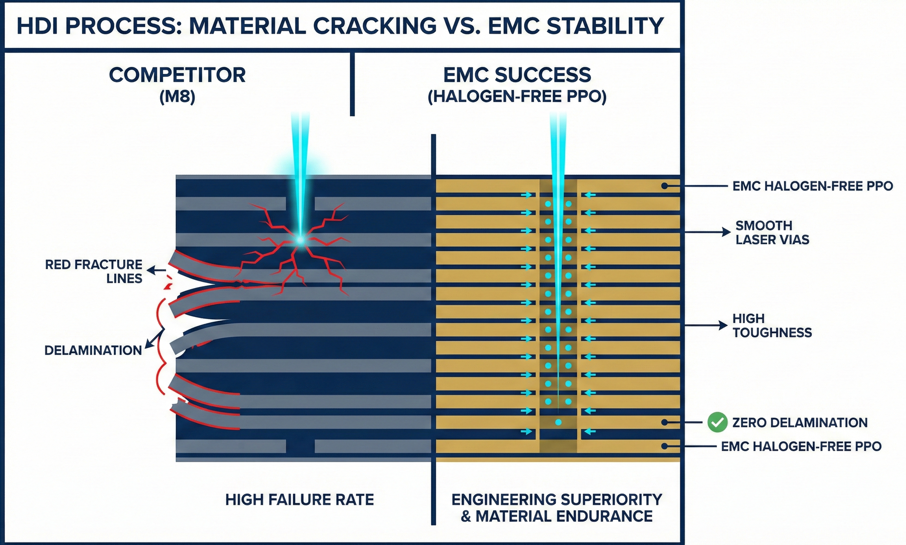 At this point, NVIDIA's engineers turned and saw Elite Material. Elite Material presented their "halogen-free formula," refined over a decade, perfectly combined with M8-grade PPO resin. This proprietary chemical cross-linking technology created an industry miracle: this board not only achieved an ultra-low signal loss of Df < 0.002, but it was also extremely robust, perfectly adapting to the multiple high-temperature lamination processes of HDI!