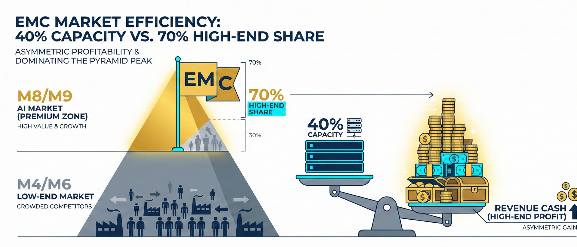 Underlying Logic: Monopolizing the Most Profitable Segment. Why can a company with less than half the capacity dominate in revenue? Because Elite Material virtually monopolizes the very top of the pyramid—the most expensive M8 grade materials—with a market share of approximately 70%.