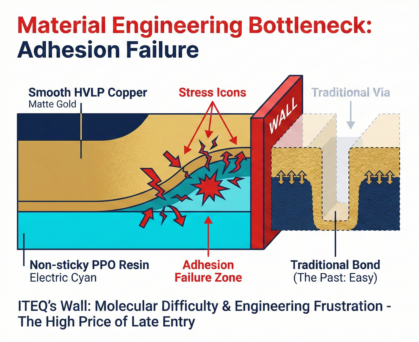 - Underlying Physical Logic for Falling Behind: As we mentioned in [4-2-1 Physics Edition], M8-grade materials must use PPO resin, which is extremely difficult to process. Elite Material (EMC) perfectly adapted to the HDI lamination process for AI servers due to its halogen-free experience from producing "Apple iPhone HDI boards." However, ITEQ had previously focused too much on through-hole lamination technology for "traditional servers (non-HDI processes)." When faced with the highly challenging HDI laser blind/buried via formation required for AI substrates, which involve "extremely smooth HVLP copper foil" and "non-adhesive PPO resin," ITEQ encountered a significant "bottleneck" in its initial yield rates and formulation adjustments.