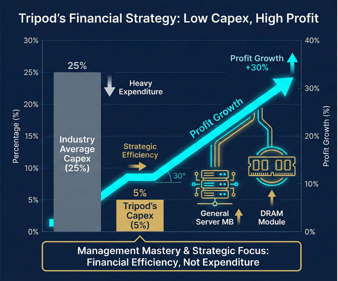 - Procurement Advantage as a Non-Mainland China Manufacturer: In the geopolitical context, Tripod Technology, as one of the few large non-Mainland Chinese PCB manufacturers, has gained high reliance from major U.S. cloud service providers (CSPs) and memory giants (such as Micron and Samsung). This "management premium" has allowed Tripod Technology to expand its gross margin by 7 percentage points since 2023 without incurring exorbitant capital expenditures, fully keeping pace with its AI peers.