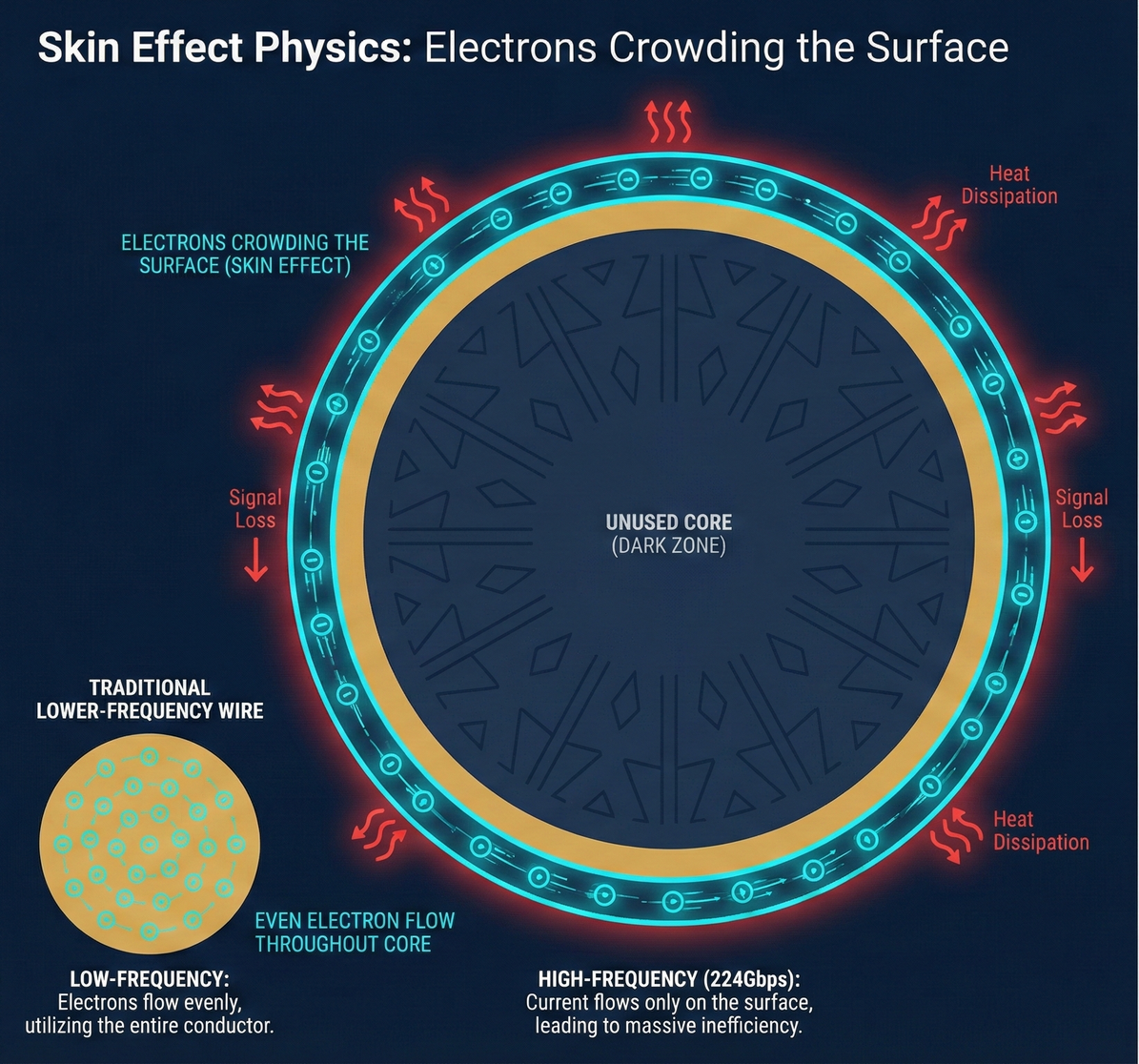 As the frequency of electrical signals increases (the standard frequency in the 1.6T era), electrons exhibit a peculiar "surface tendency." They no longer distribute uniformly throughout the copper conductor but instead crowd into the extremely thin "surface layer" of the wire. This leads to the following three devastating consequences: