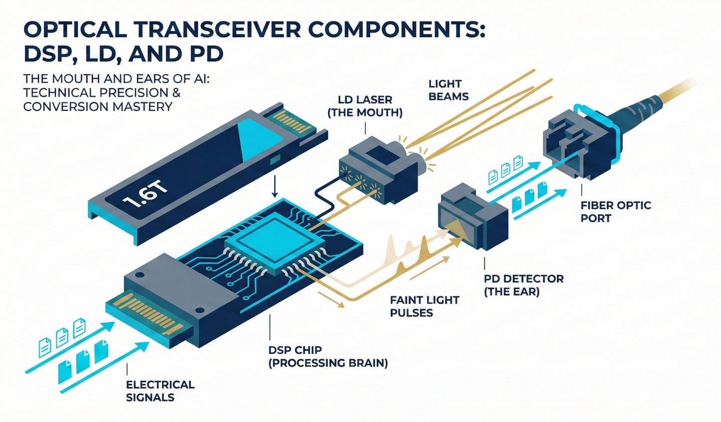 - LD (Laser Diode) — The Mouth: The core light-emitting component. In the 1.6T era, LDs must complete hundreds of billions of on/off cycles (or modulations) in an extremely short time, and the light purity must be exceptionally high.