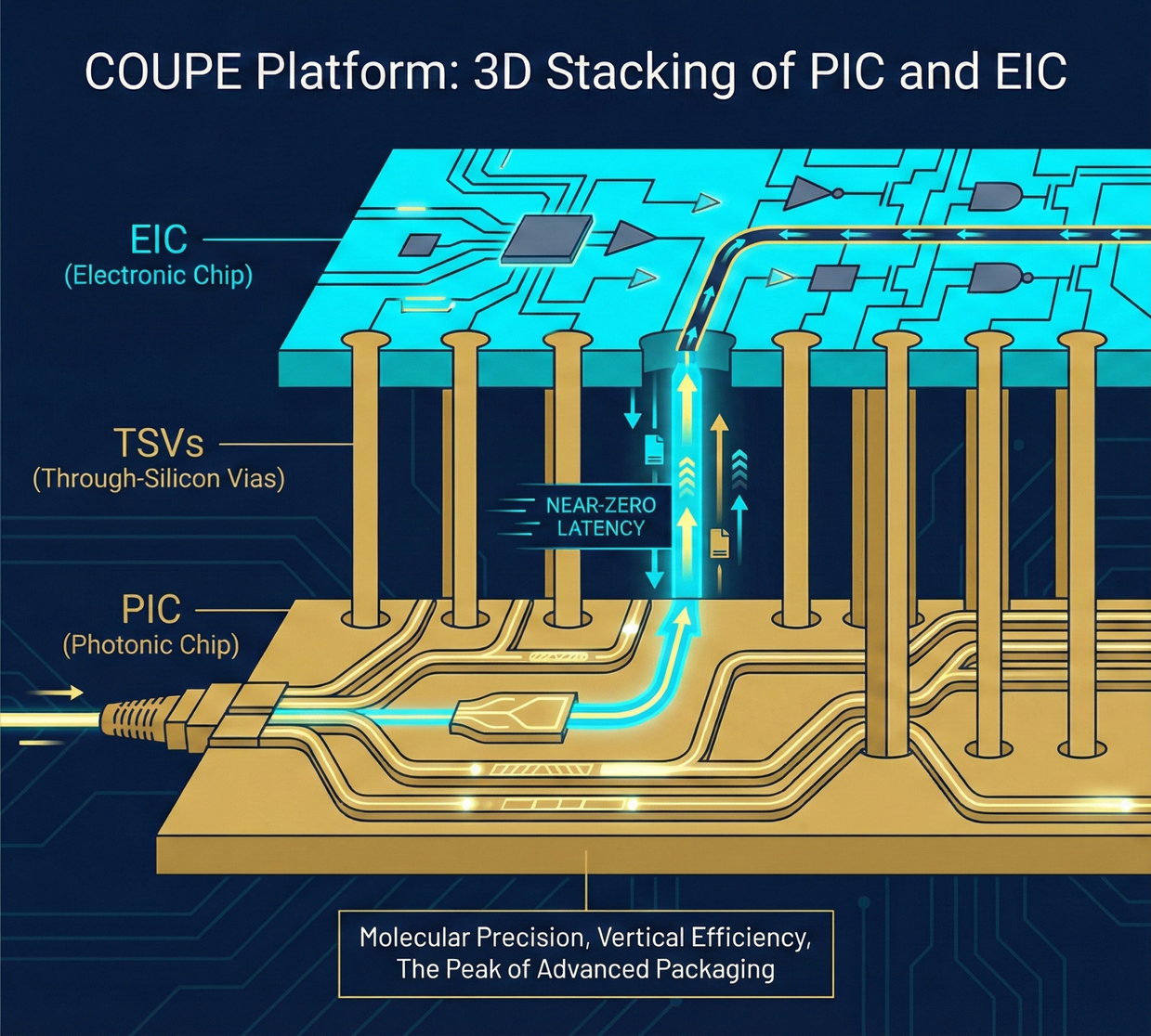 - COUPE's Vertical Stitching: TSMC utilizes its SoIC (System-on-Integrated-Chips) packaging technology to directly "stack" the EIC on top of the PIC (3D Stacking).
