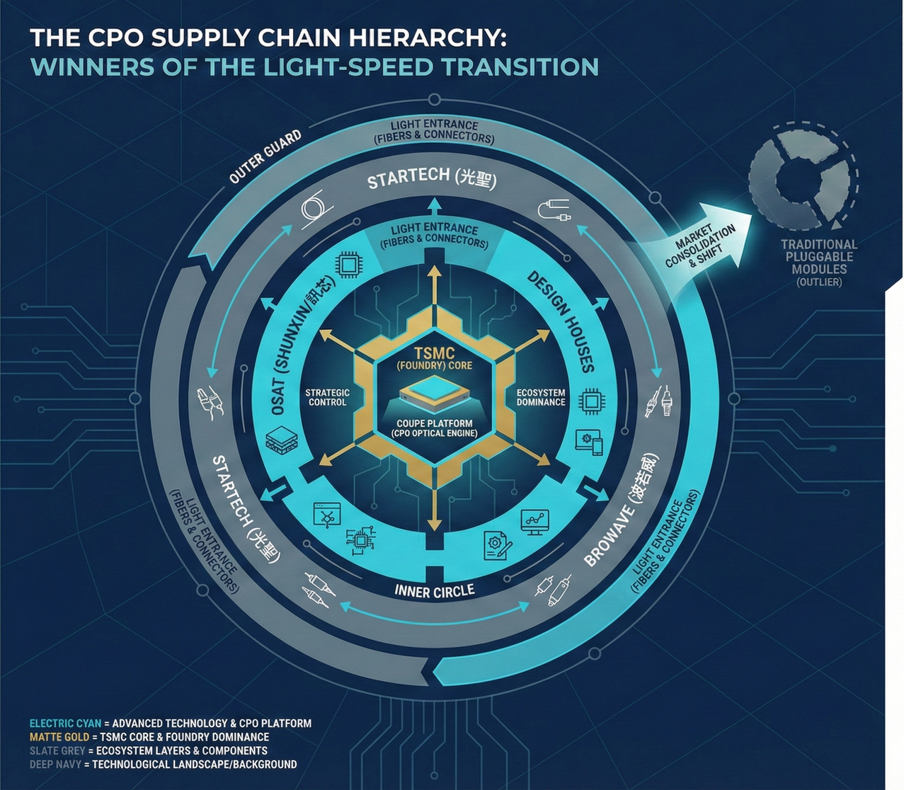 CPO requires extremely high-precision optical alignment packaging. While TSMC is strong, it focuses on the most critical 3D stacking, leaving a substantial amount of back-end optical sub-assembly (OE) and testing work to be supported by specialized OSATs.