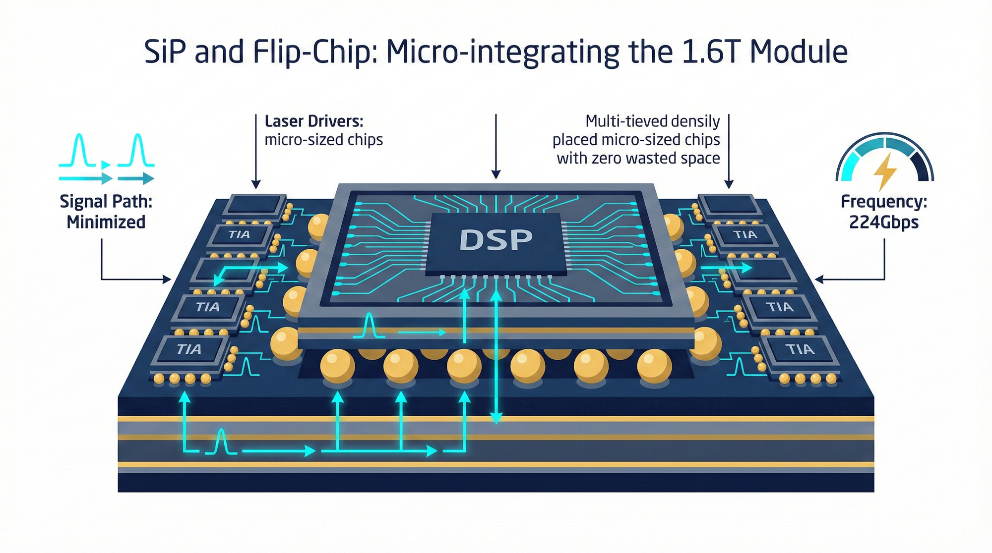 Extreme Physical Space Optimization: In 1.6T OSFP modules, the internal space is already too constrained to accommodate traditional discrete components. InnoLight leverages its SiP technology to achieve highly miniaturized integration of the DSP brain, Laser Driver, and Transimpedance Amplifier (TIA). This capability represents a formidable barrier for tier-two manufacturers.