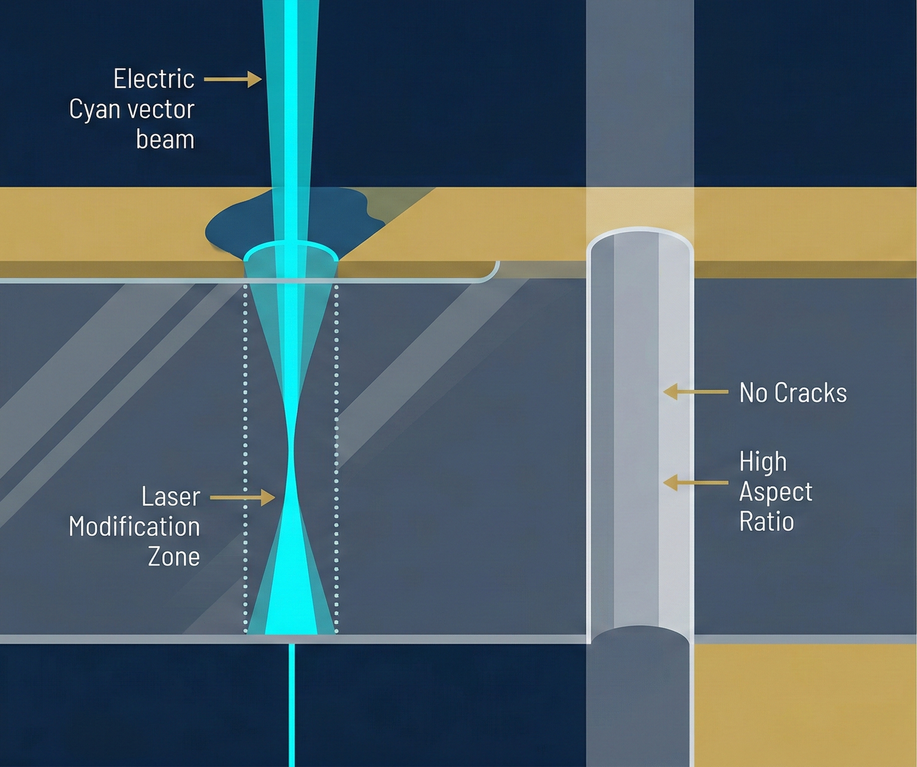 But a problem arises: glass is extremely smooth and hard. How do you drill hundreds of thousands of vertical deep holes, each only a few micrometers in diameter (for electrical conduction), into a piece of glass? With a drill? The glass would shatter instantly.