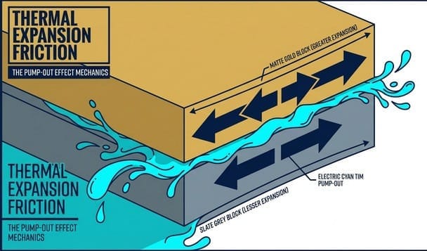This shearing motion is similar to squeezing toothpaste every day. The layer of thermal paste (TIM) sandwiched in between is gradually "pumped out" (extruded) from the chip's edges with each "breathing motion."