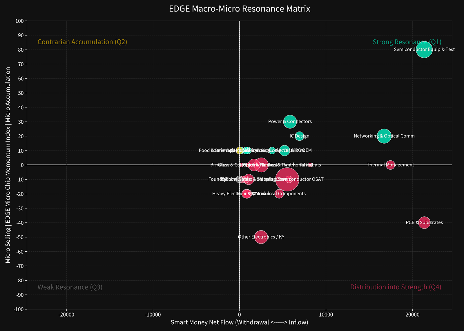Matrix Distribution and Micro-level Chip Analysis Through the EDGE Industry Resonance Bubble Matrix, we can cross-reference "macro-level capital net flows (X-axis)" with "micro-level chip momentum index (Y-axis)" to uncover the true intentions of market capital. This week's four-quadrant capital distribution shows extreme divergence and high hidden characteristics: